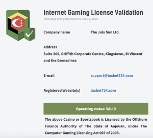 Luxbet, The July Sun LTD tarafından işletilen ve Luxbet724.com üzerinden hizmet veren bir platformdur. Site, Komorlar Birliği’ne bağlı Anjouan Adası Hükûmeti tarafından lisanslanmış olup Lisans No: ALSI-202503031-FI2 ile faaliyet göstermektedir. Kullanıcılar destek için destek@luxbet724.com adresi üzerinden iletişime geçebilir.